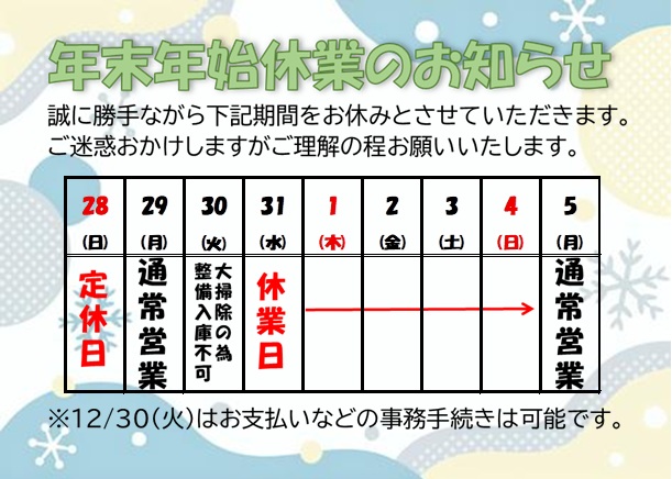年末年始のお休みのお知らせです